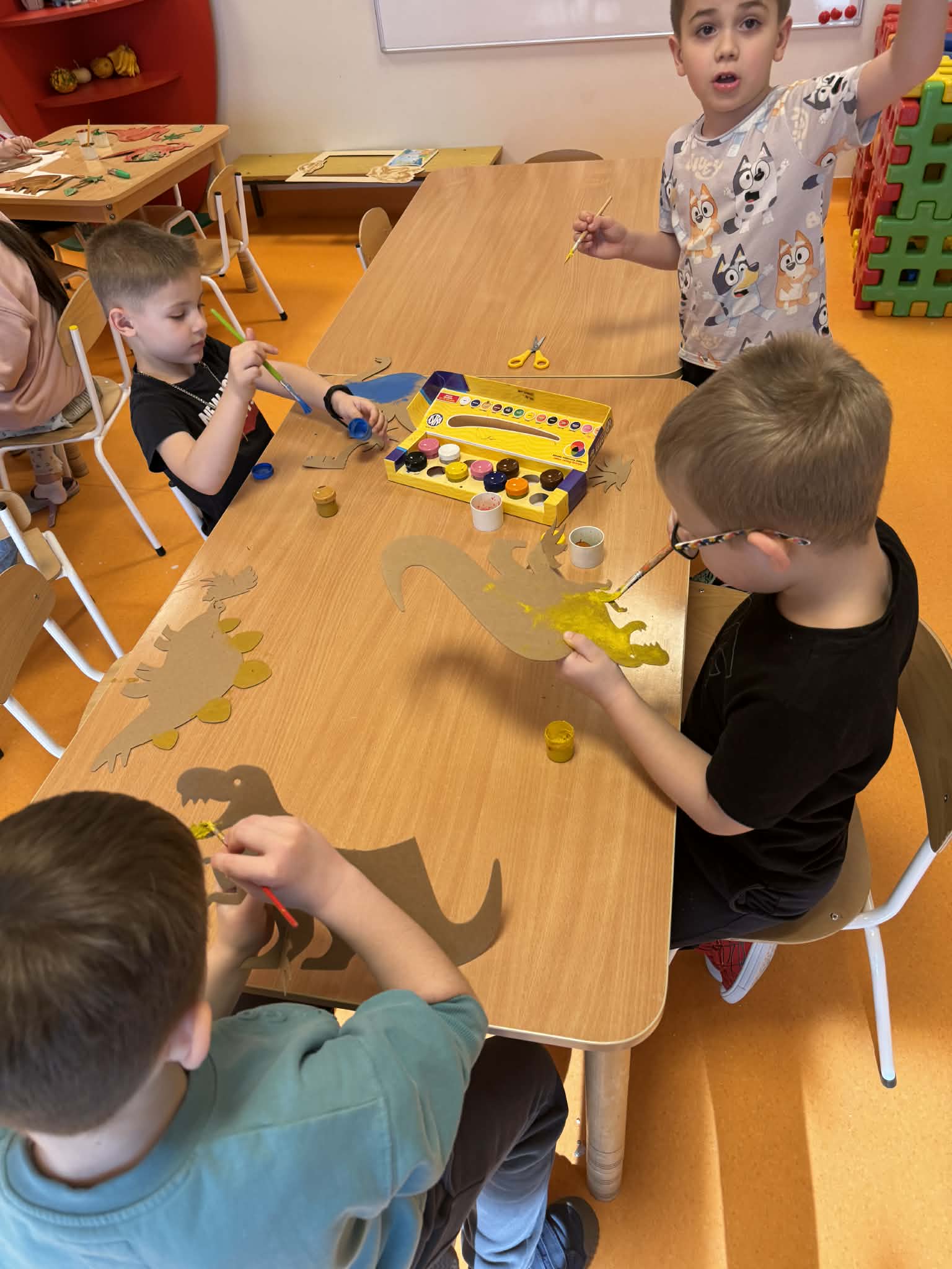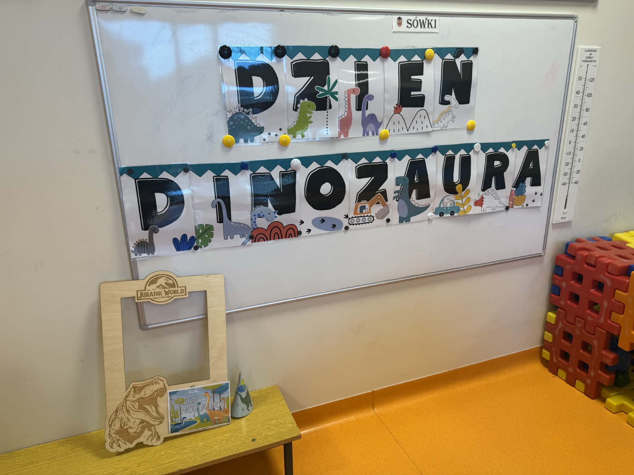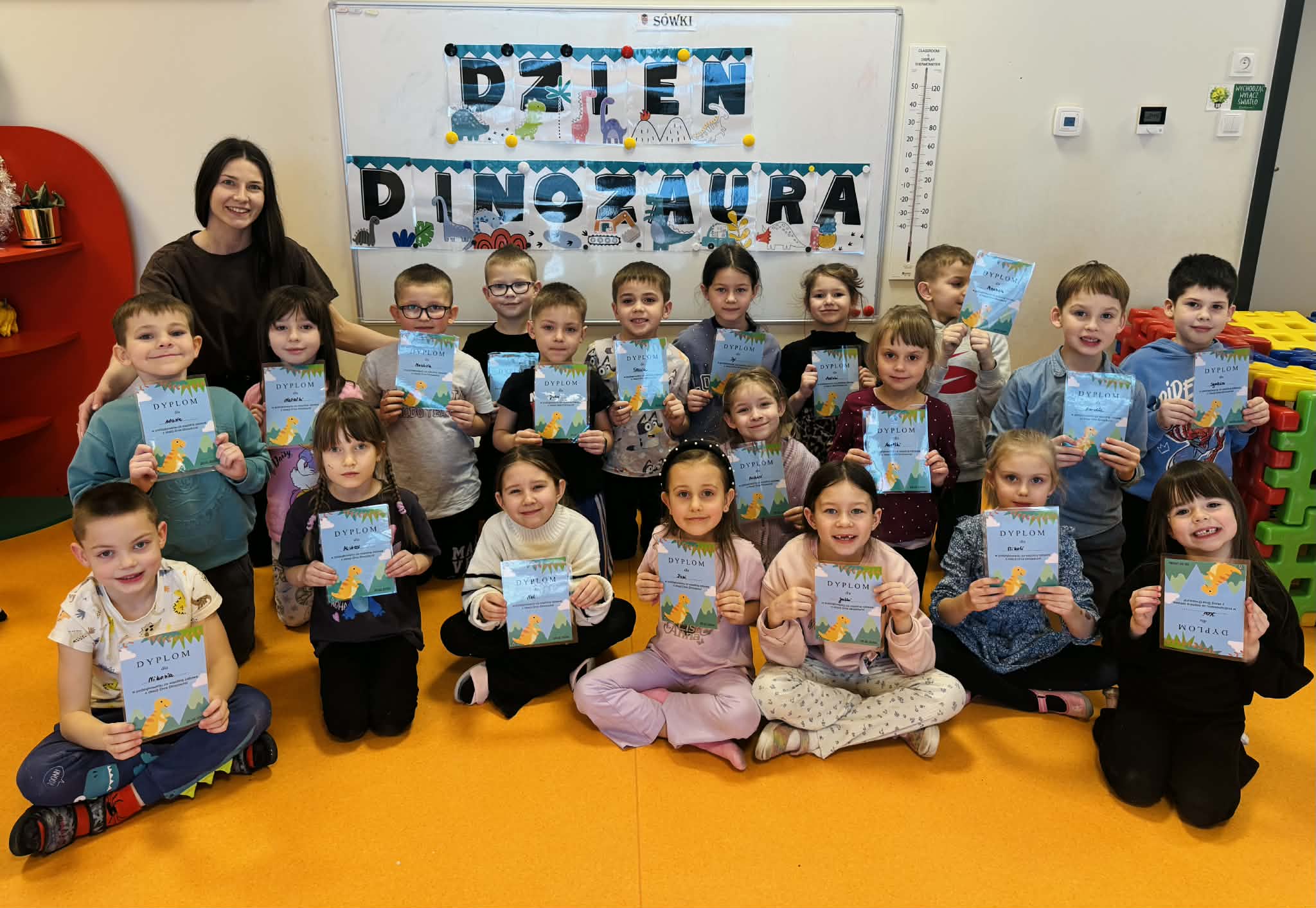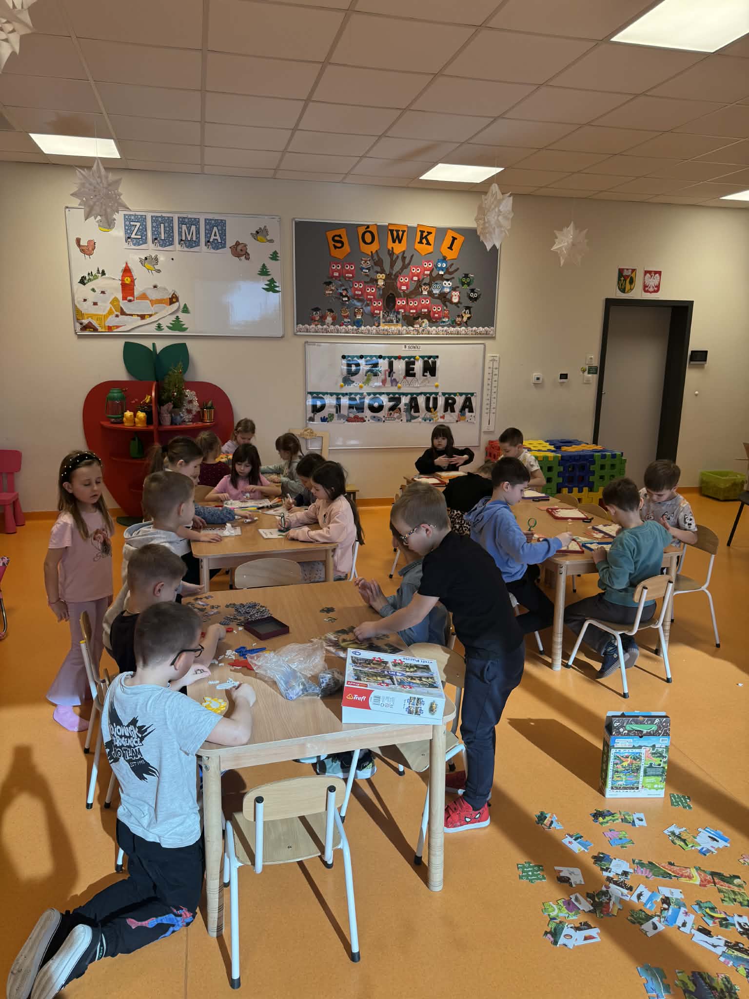 Dziś Sówki Pomarańczowe miały zajęcia z okazji Dnia Dinozaura. Przygotowane stacje zawierały wykopaliska paleontologiczne, puzzle tematyczne, układanki magnetyczne, książki z ciekawostkami w tym Albik, karty grafomotoryczne wielokrotnego użytku. Na koniec dzieci wykonały prace plastyczną z wykorzystaniem kartonowych szablonów, które ozdobiły farbami według własnego pomysłu. Różnorodne aktywności zakończyły sie zdjęciem w fotobudce. Dinozaury opanowały całą salę.