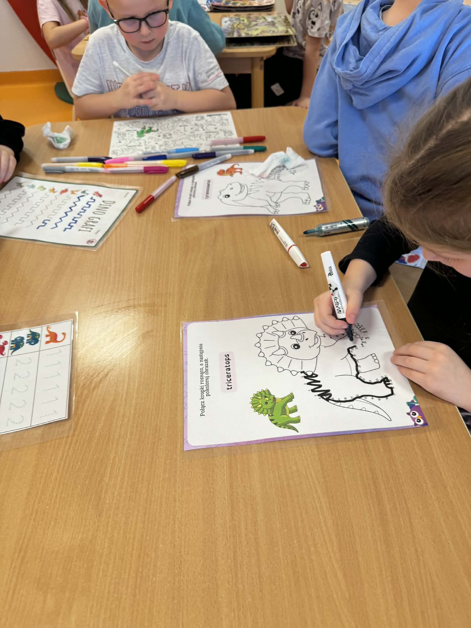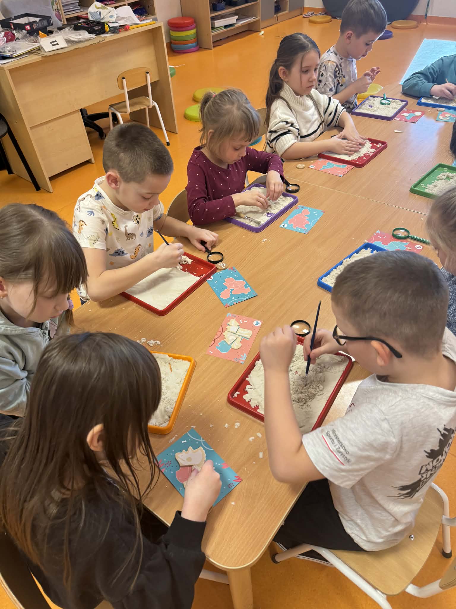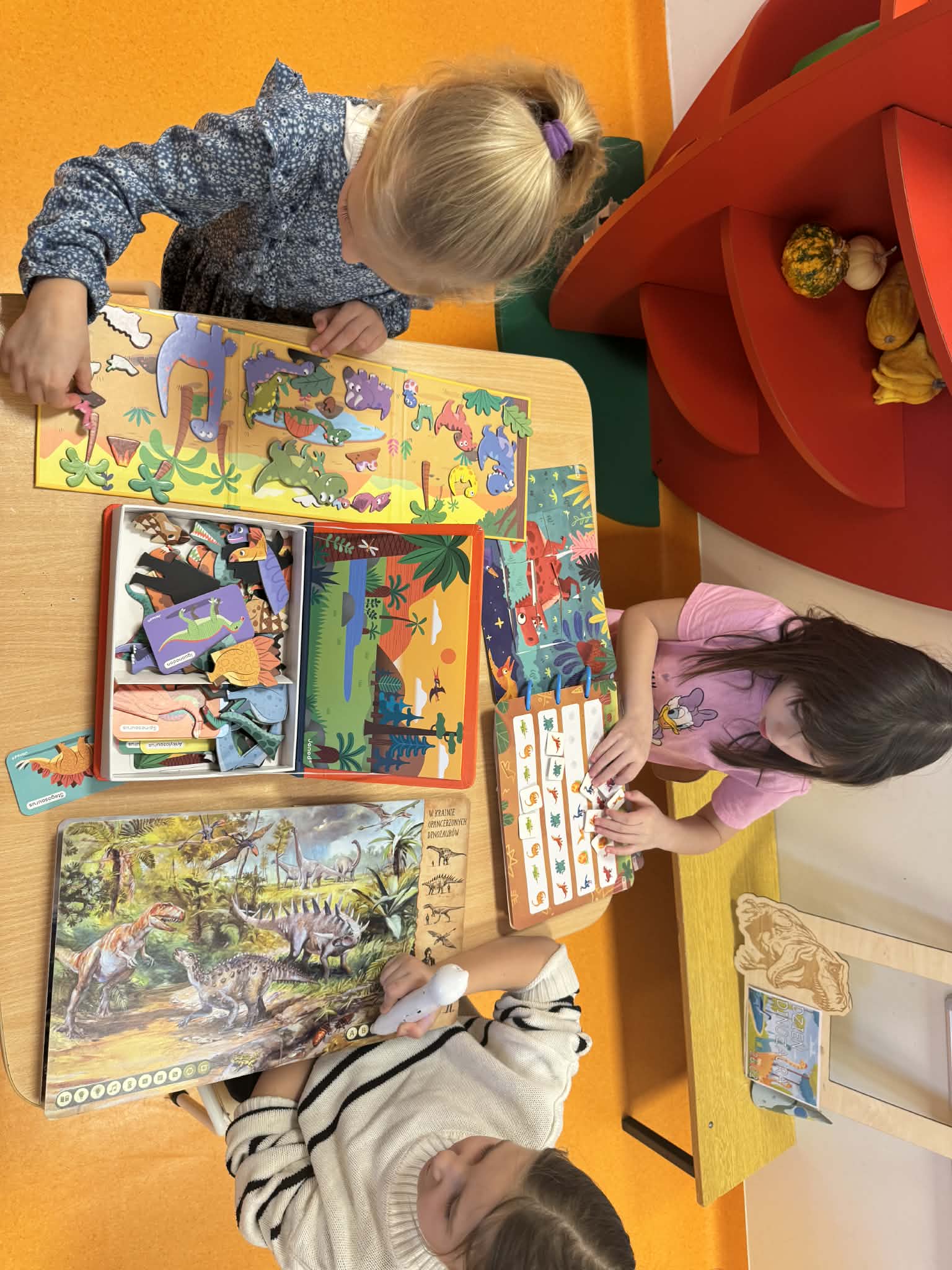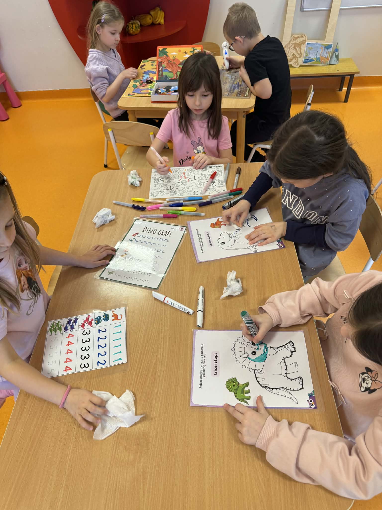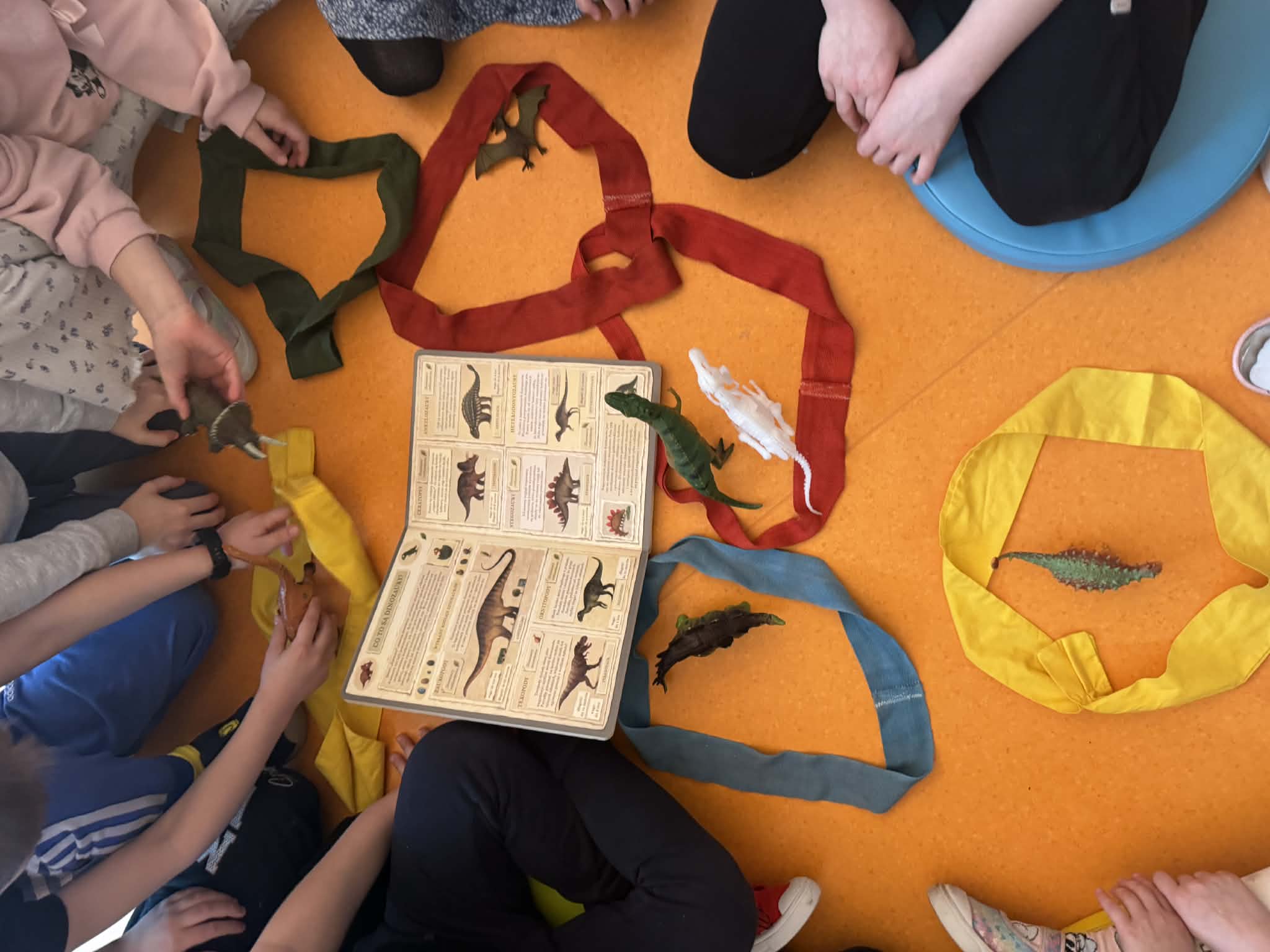 Dziś Sówki Pomarańczowe miały zajęcia z okazji Dnia Dinozaura. Przygotowane stacje zawierały wykopaliska paleontologiczne, puzzle tematyczne, układanki magnetyczne, książki z ciekawostkami w tym Albik, karty grafomotoryczne wielokrotnego użytku. Na koniec dzieci wykonały prace plastyczną z wykorzystaniem kartonowych szablonów, które ozdobiły farbami według własnego pomysłu. Różnorodne aktywności zakończyły sie zdjęciem w fotobudce. Dinozaury opanowały całą salę.