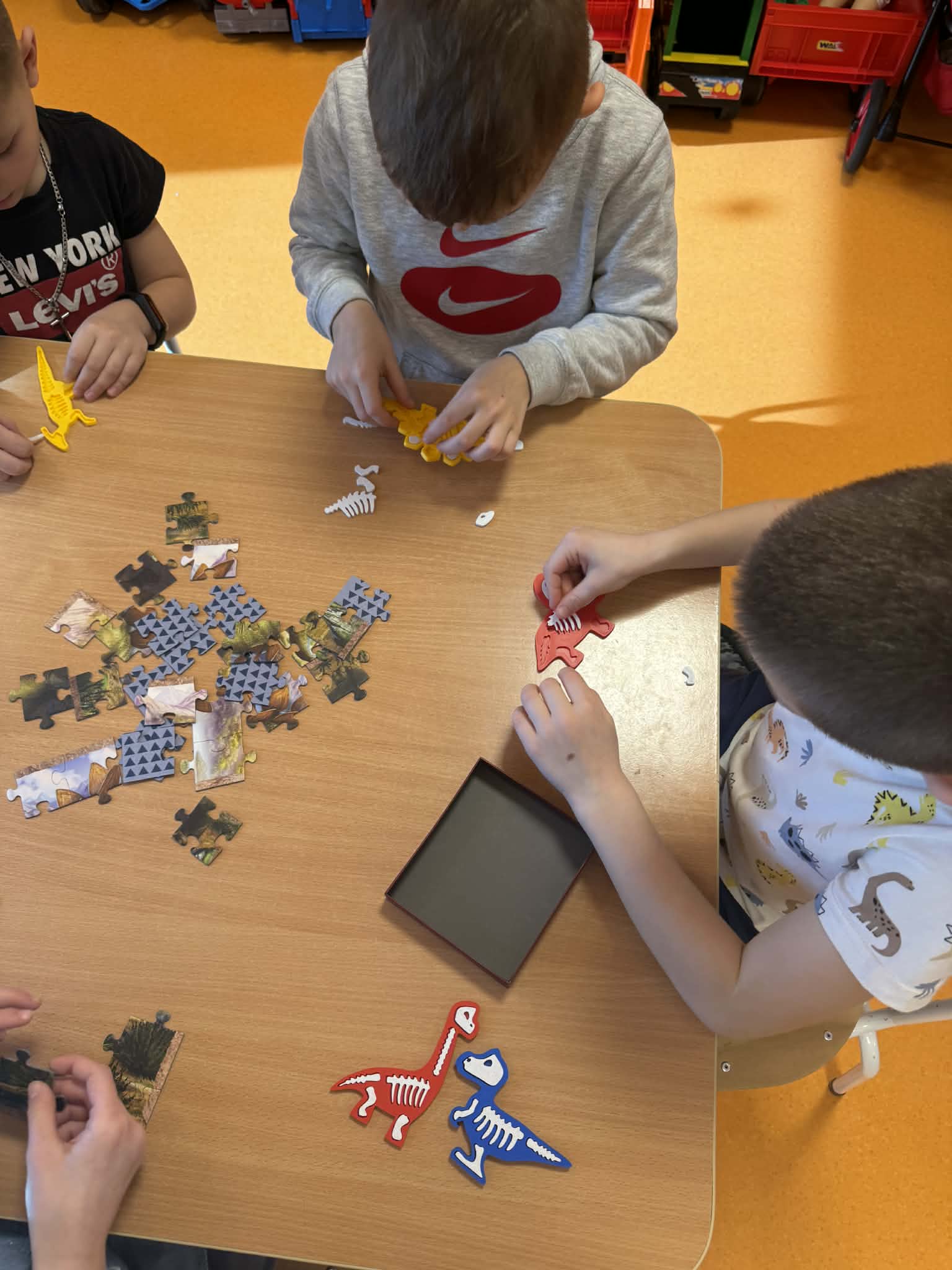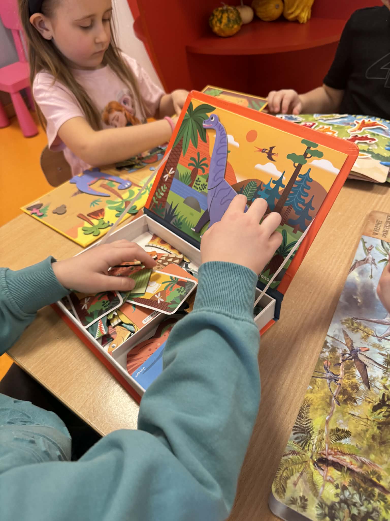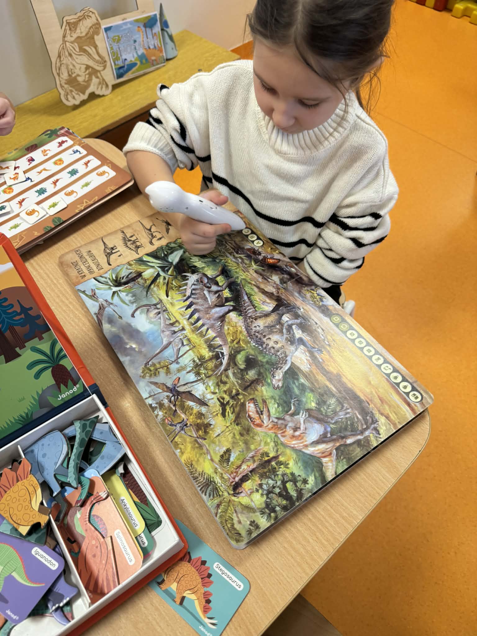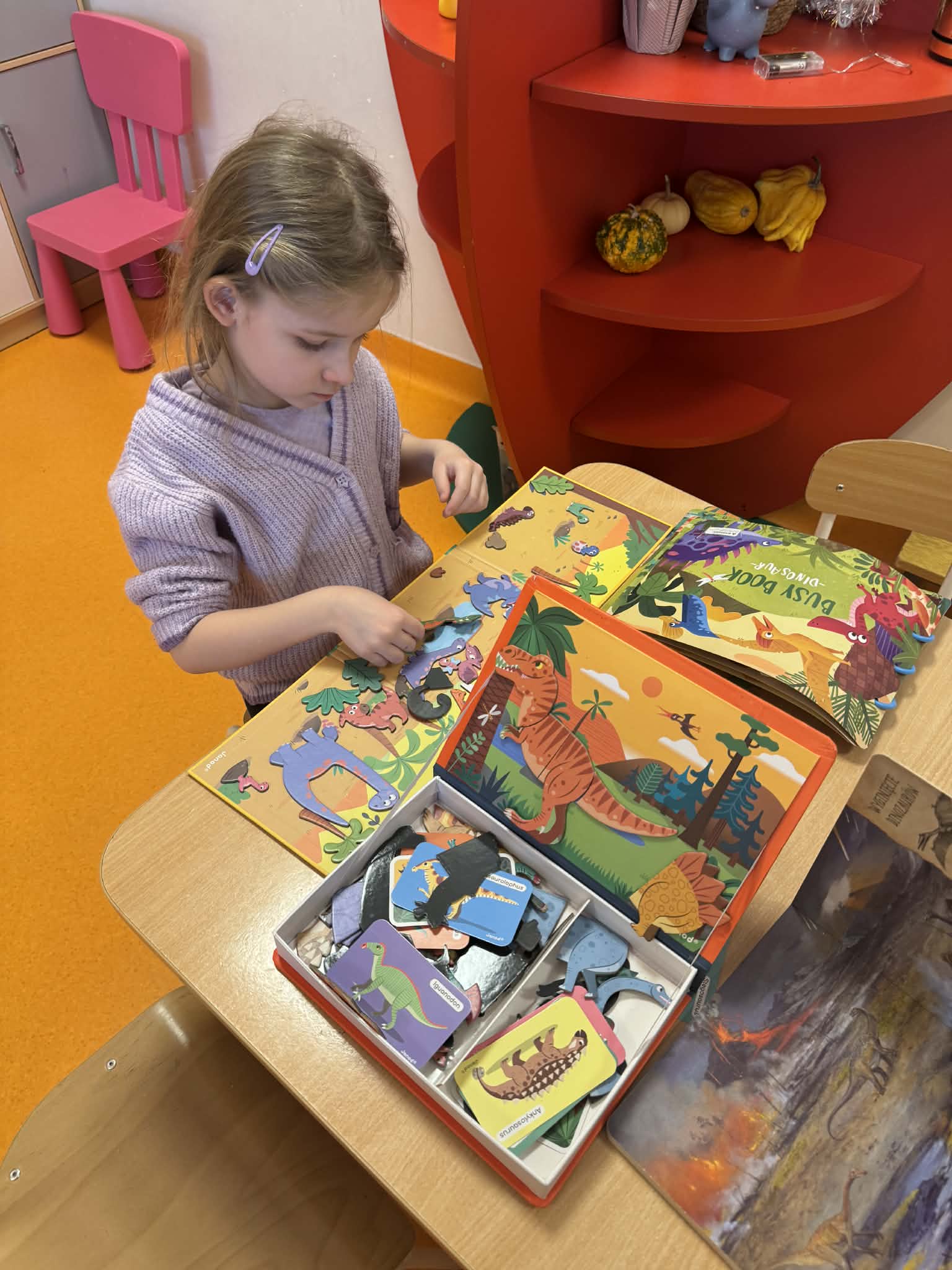 Dziś Sówki Pomarańczowe miały zajęcia z okazji Dnia Dinozaura. Przygotowane stacje zawierały wykopaliska paleontologiczne, puzzle tematyczne, układanki magnetyczne, książki z ciekawostkami w tym Albik, karty grafomotoryczne wielokrotnego użytku. Na koniec dzieci wykonały prace plastyczną z wykorzystaniem kartonowych szablonów, które ozdobiły farbami według własnego pomysłu. Różnorodne aktywności zakończyły sie zdjęciem w fotobudce. Dinozaury opanowały całą salę.