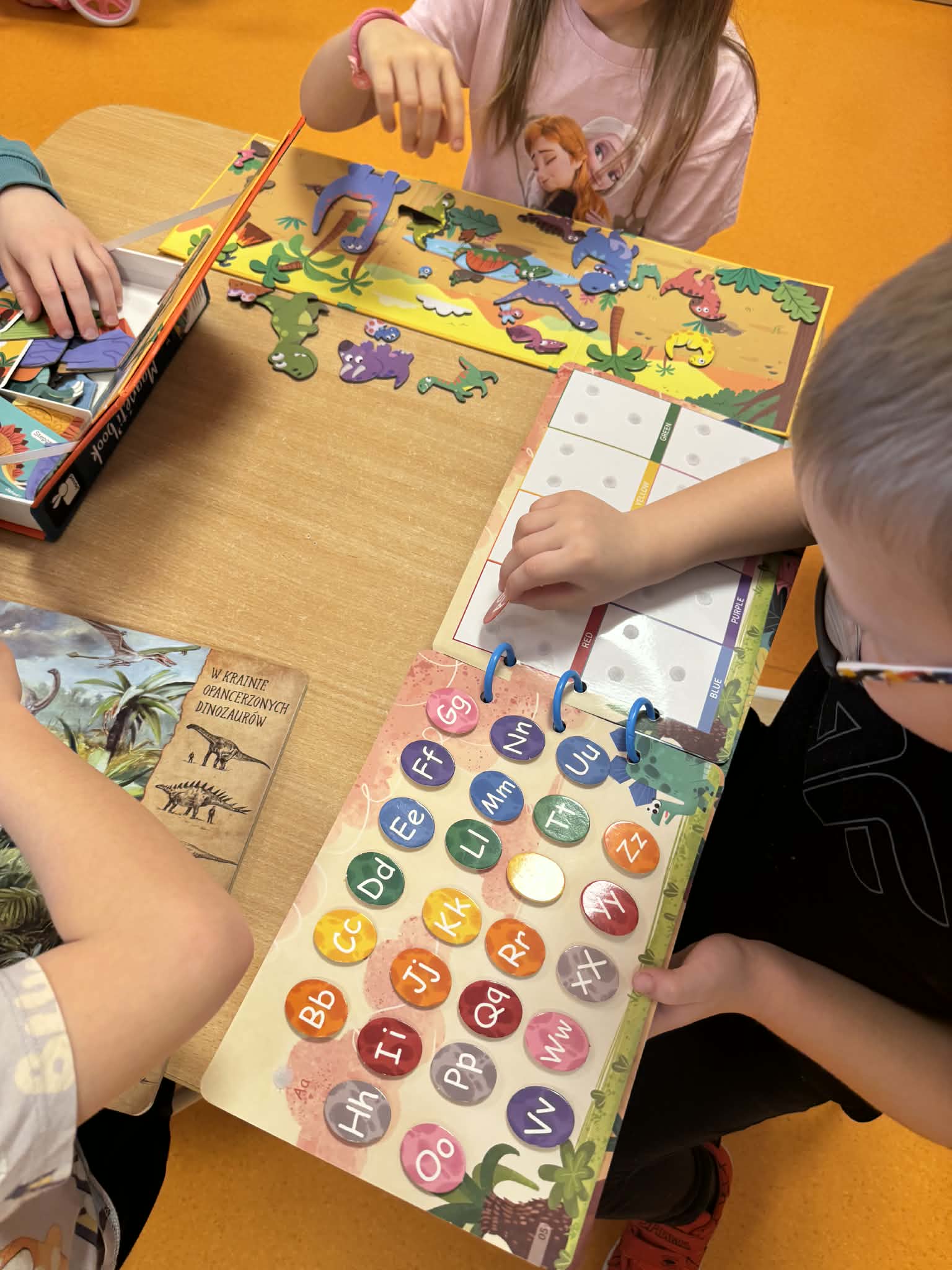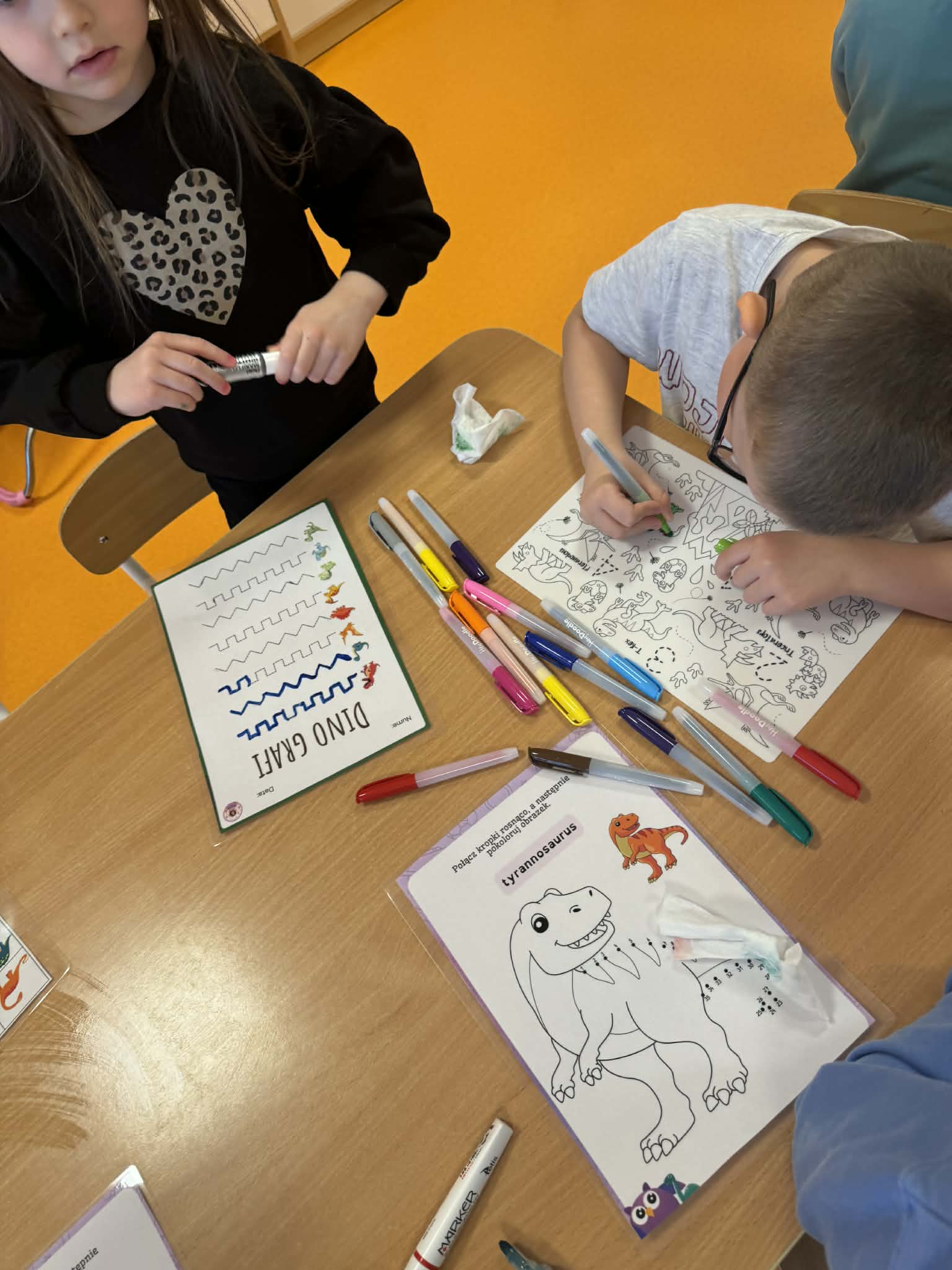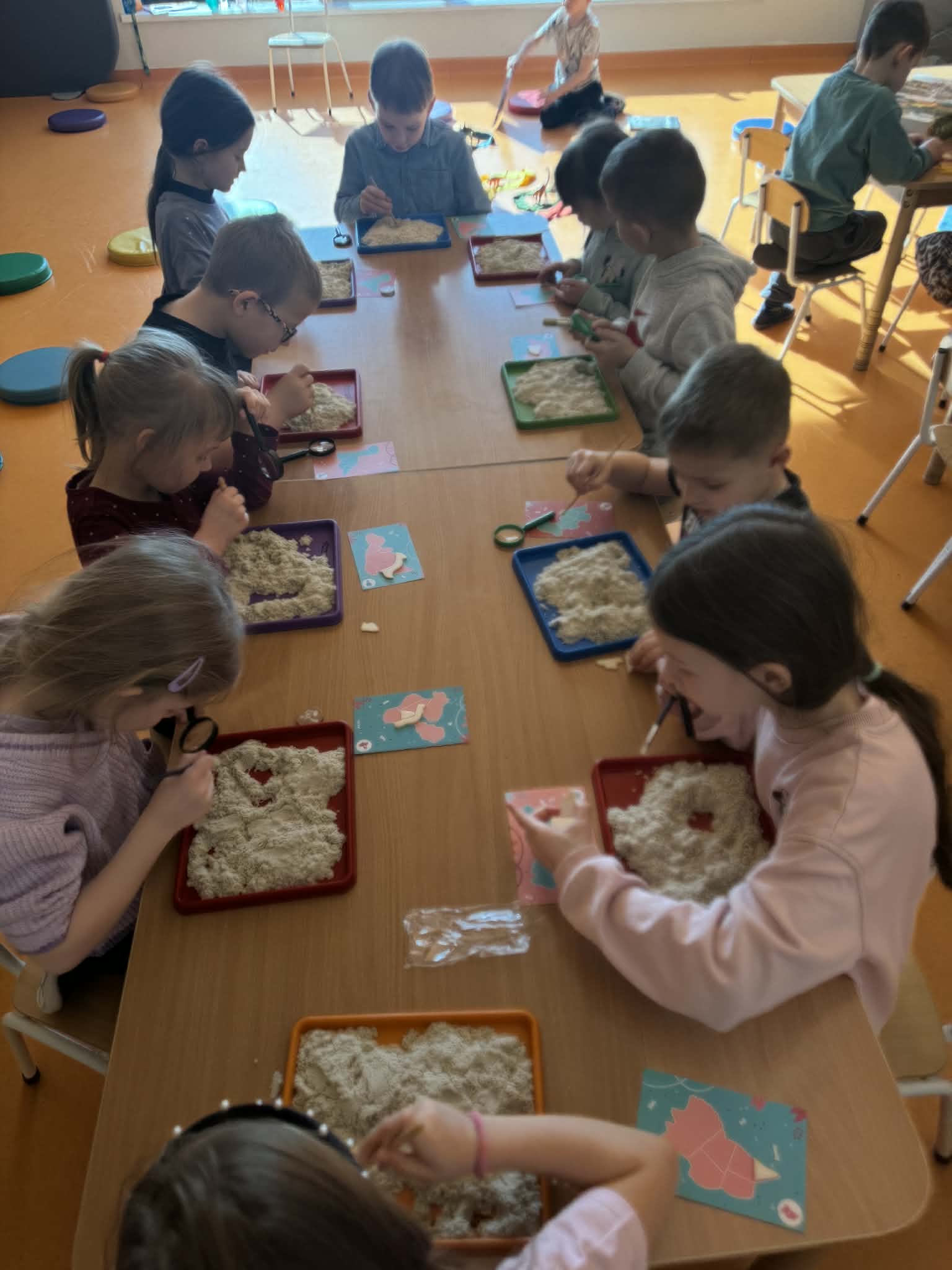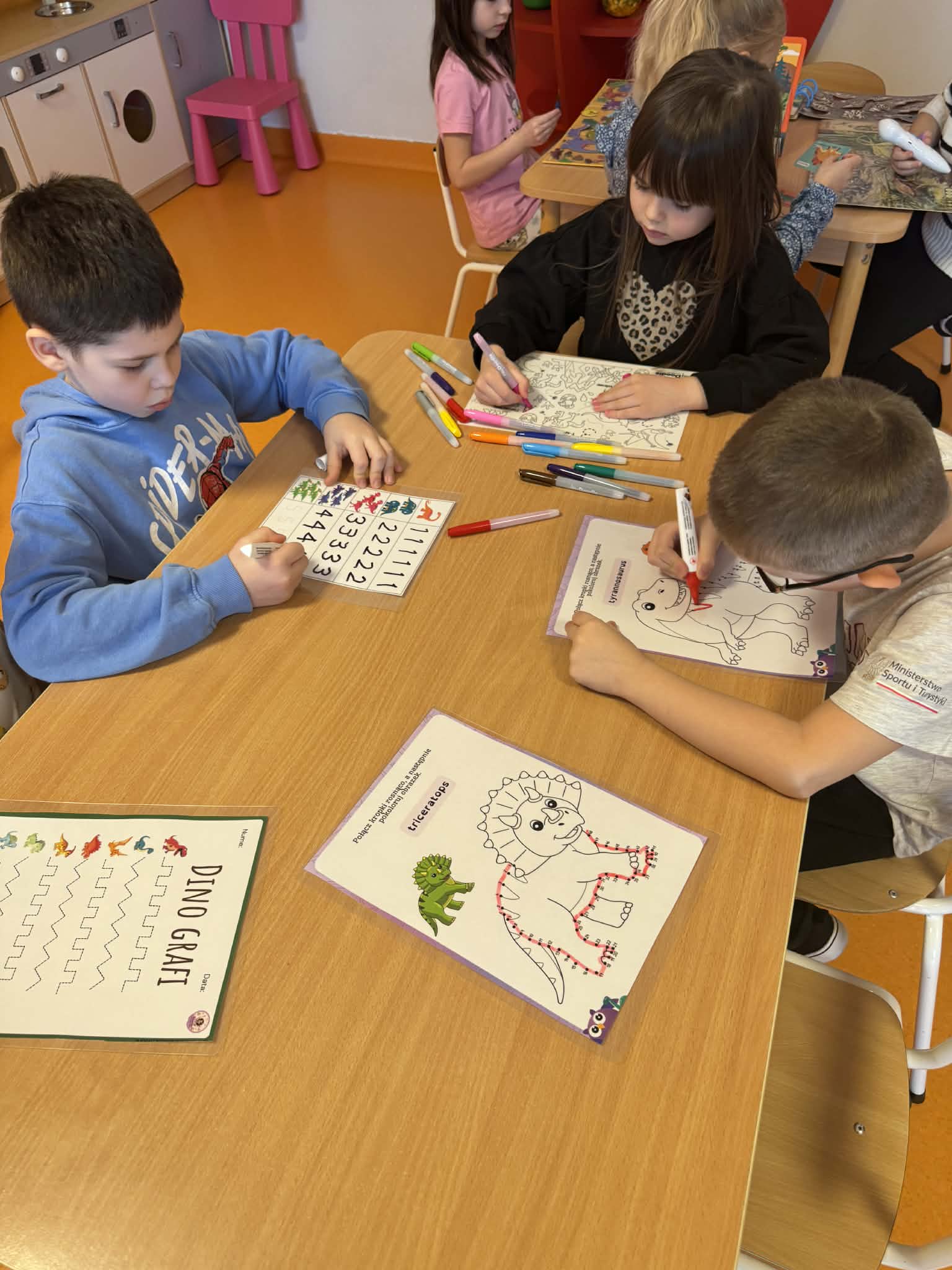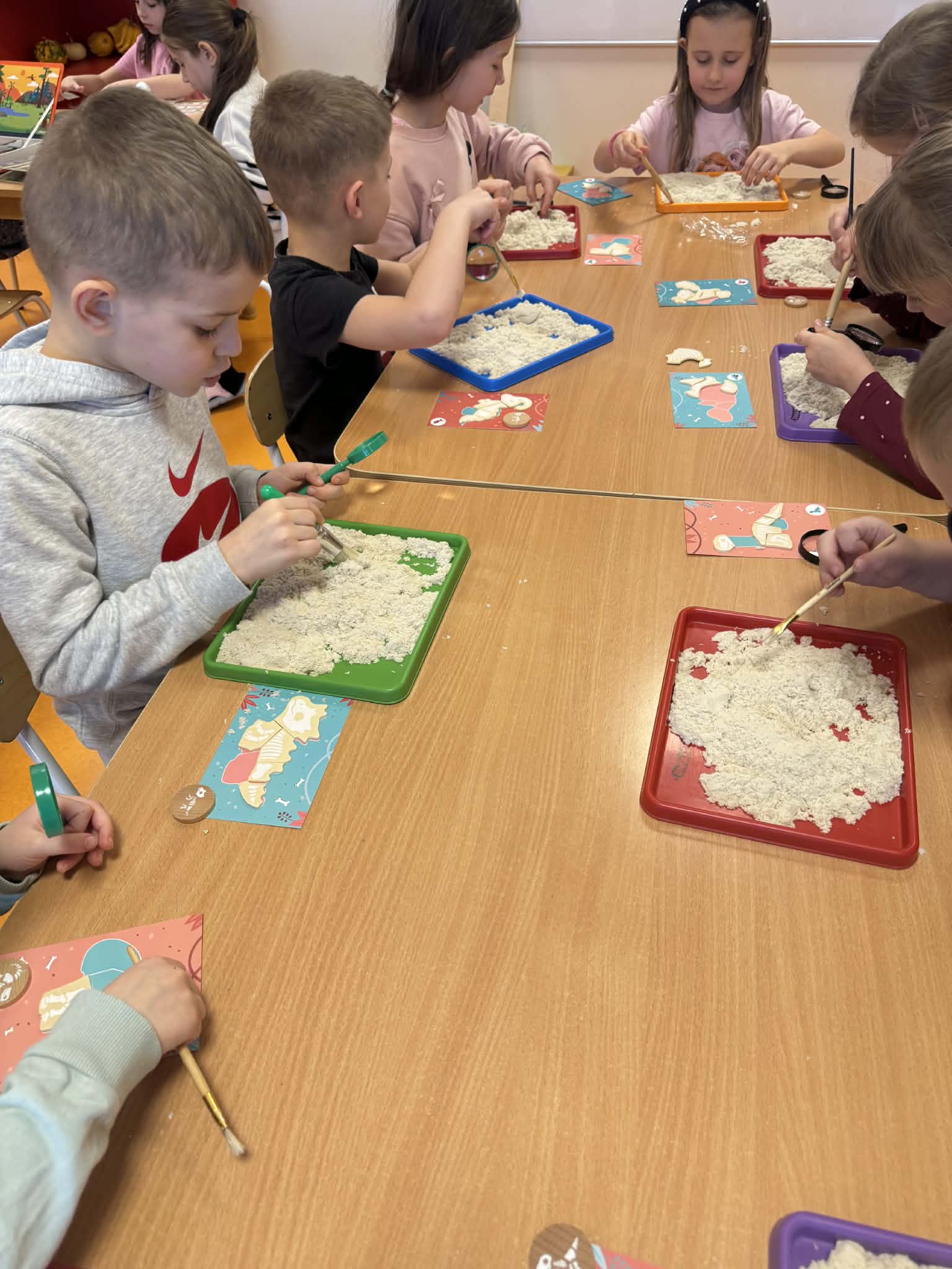 Dziś Sówki Pomarańczowe miały zajęcia z okazji Dnia Dinozaura. Przygotowane stacje zawierały wykopaliska paleontologiczne, puzzle tematyczne, układanki magnetyczne, książki z ciekawostkami w tym Albik, karty grafomotoryczne wielokrotnego użytku. Na koniec dzieci wykonały prace plastyczną z wykorzystaniem kartonowych szablonów, które ozdobiły farbami według własnego pomysłu. Różnorodne aktywności zakończyły sie zdjęciem w fotobudce. Dinozaury opanowały całą salę.