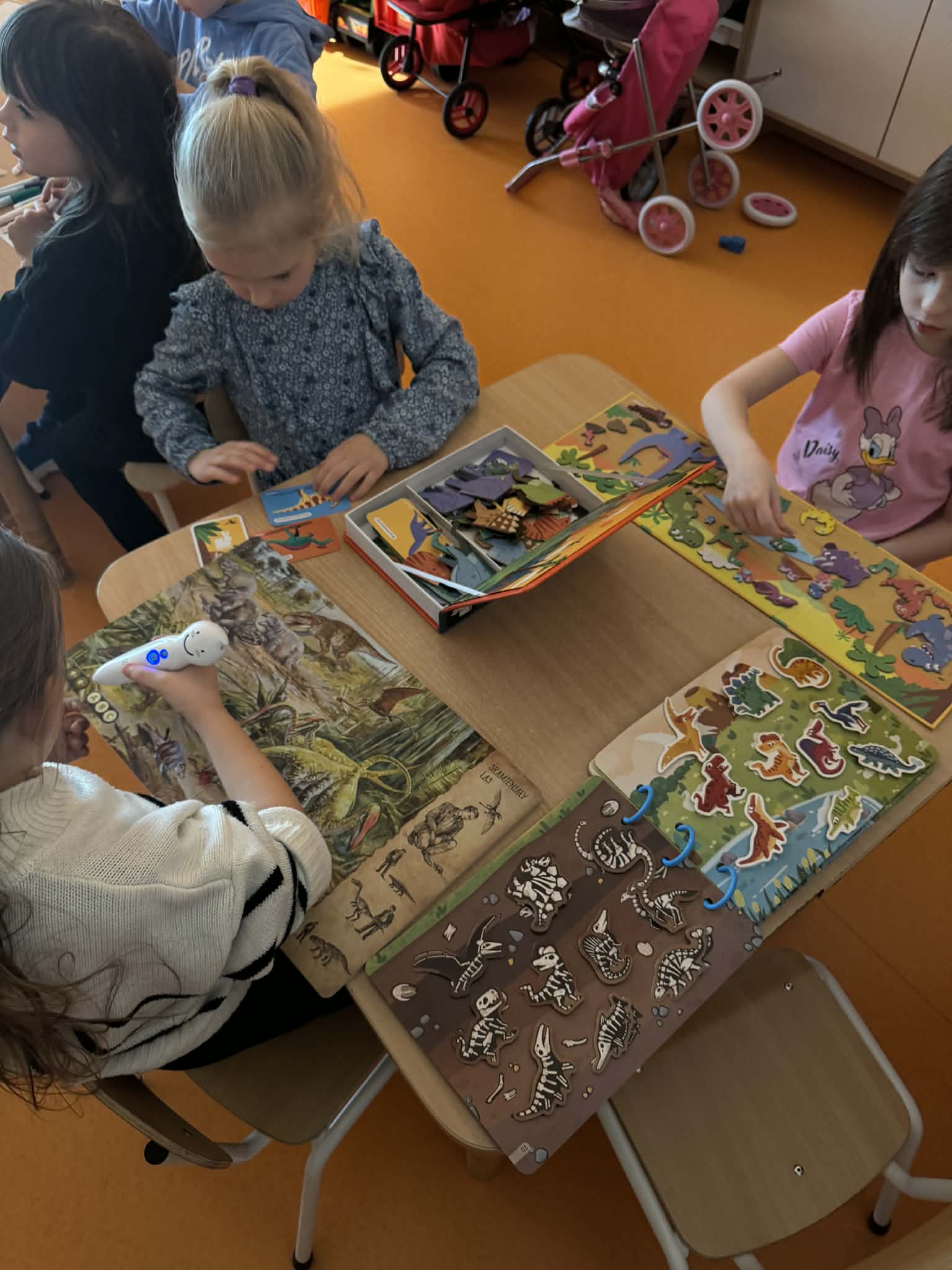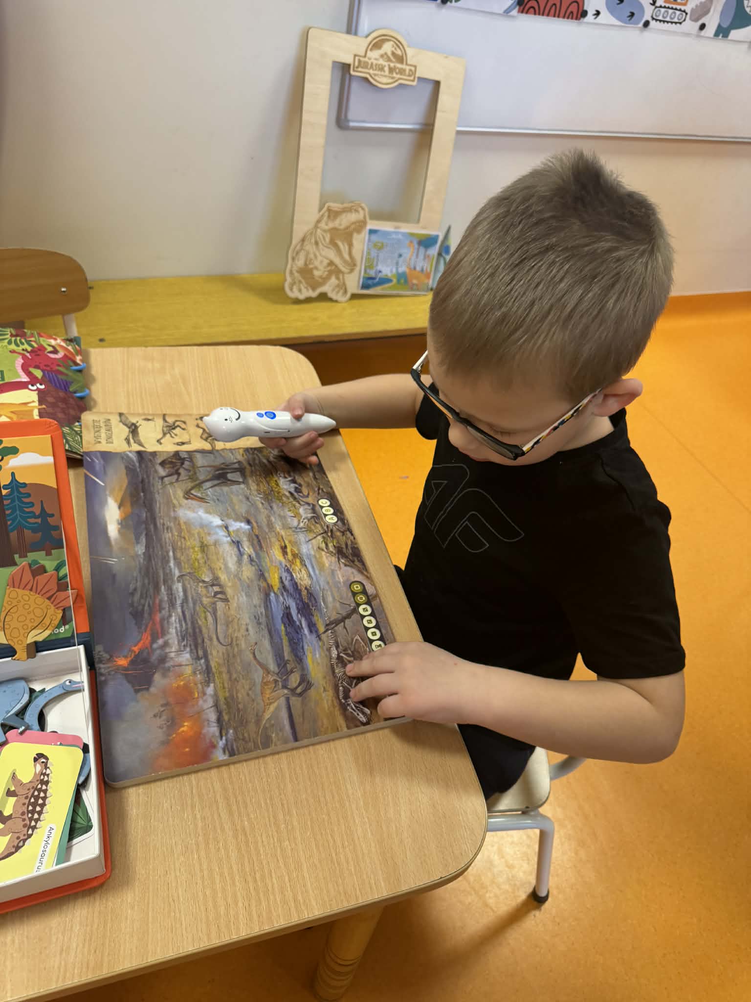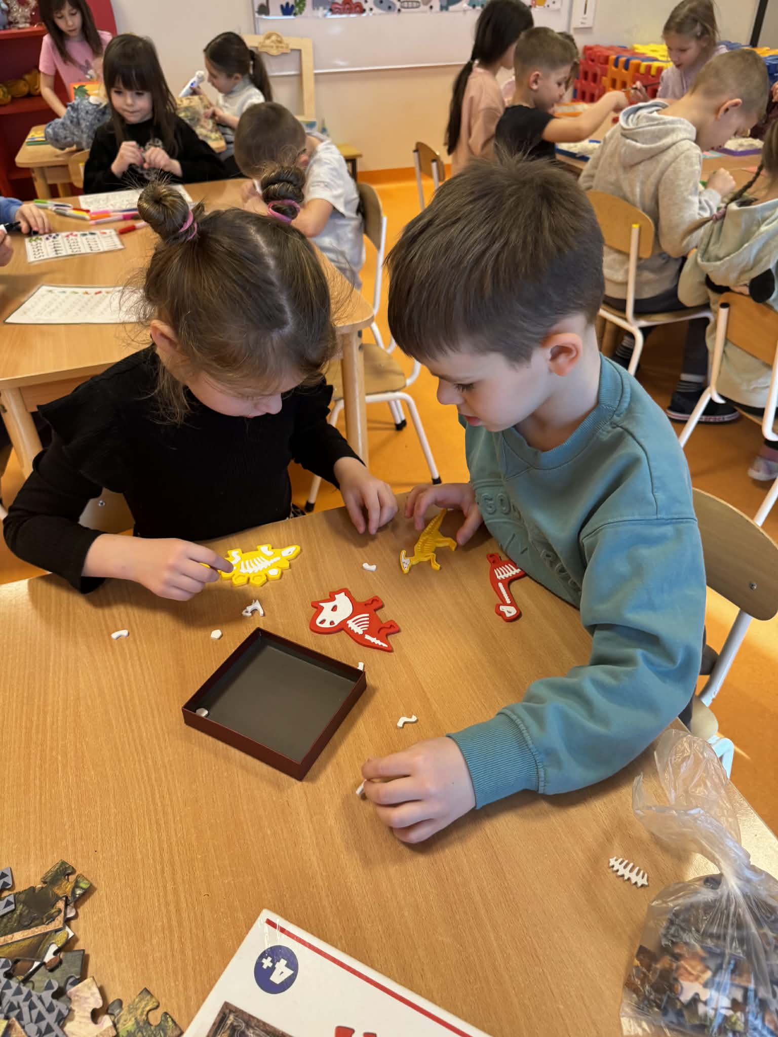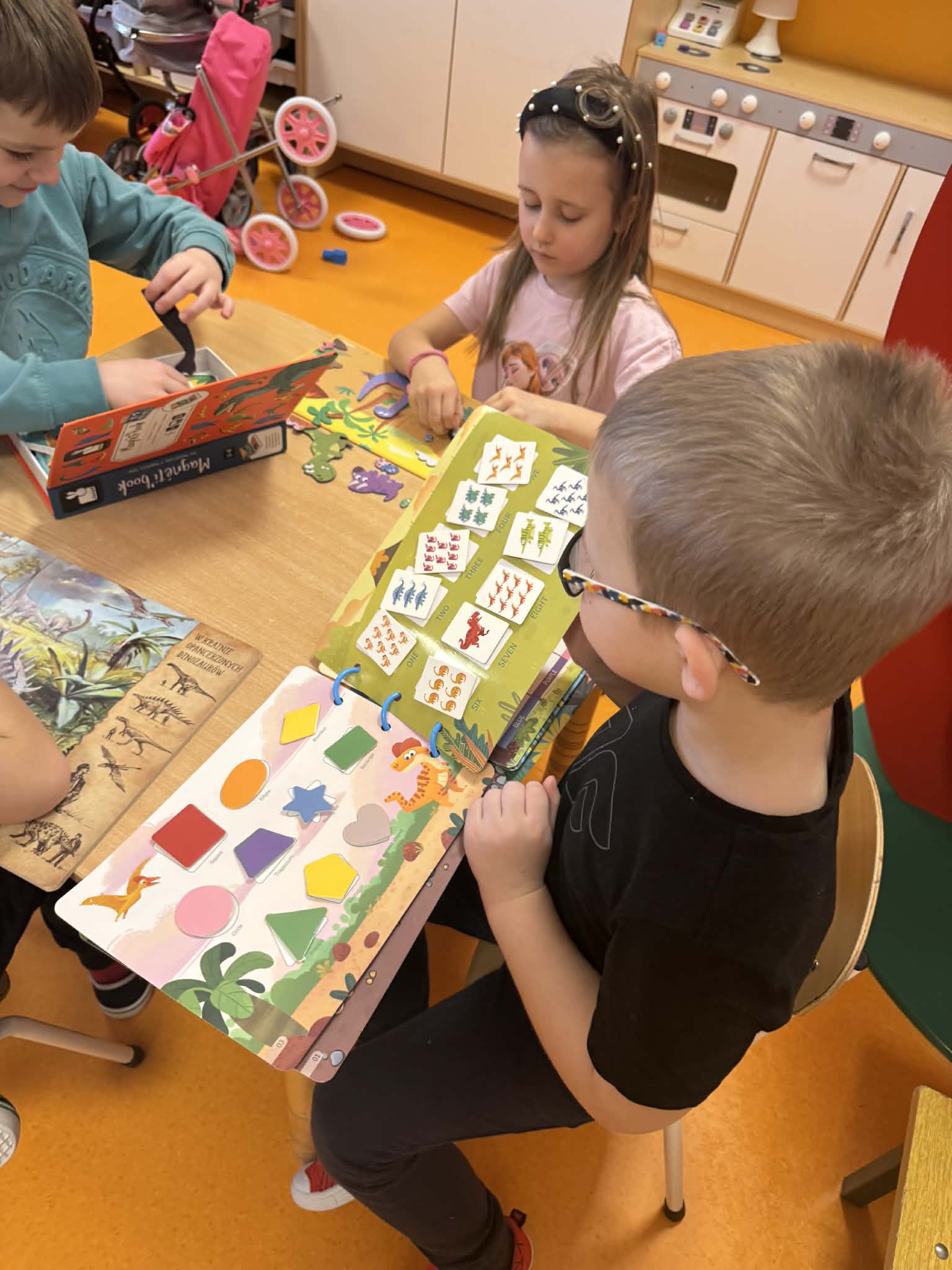 Dziś Sówki Pomarańczowe miały zajęcia z okazji Dnia Dinozaura. Przygotowane stacje zawierały wykopaliska paleontologiczne, puzzle tematyczne, układanki magnetyczne, książki z ciekawostkami w tym Albik, karty grafomotoryczne wielokrotnego użytku. Na koniec dzieci wykonały prace plastyczną z wykorzystaniem kartonowych szablonów, które ozdobiły farbami według własnego pomysłu. Różnorodne aktywności zakończyły sie zdjęciem w fotobudce. Dinozaury opanowały całą salę.