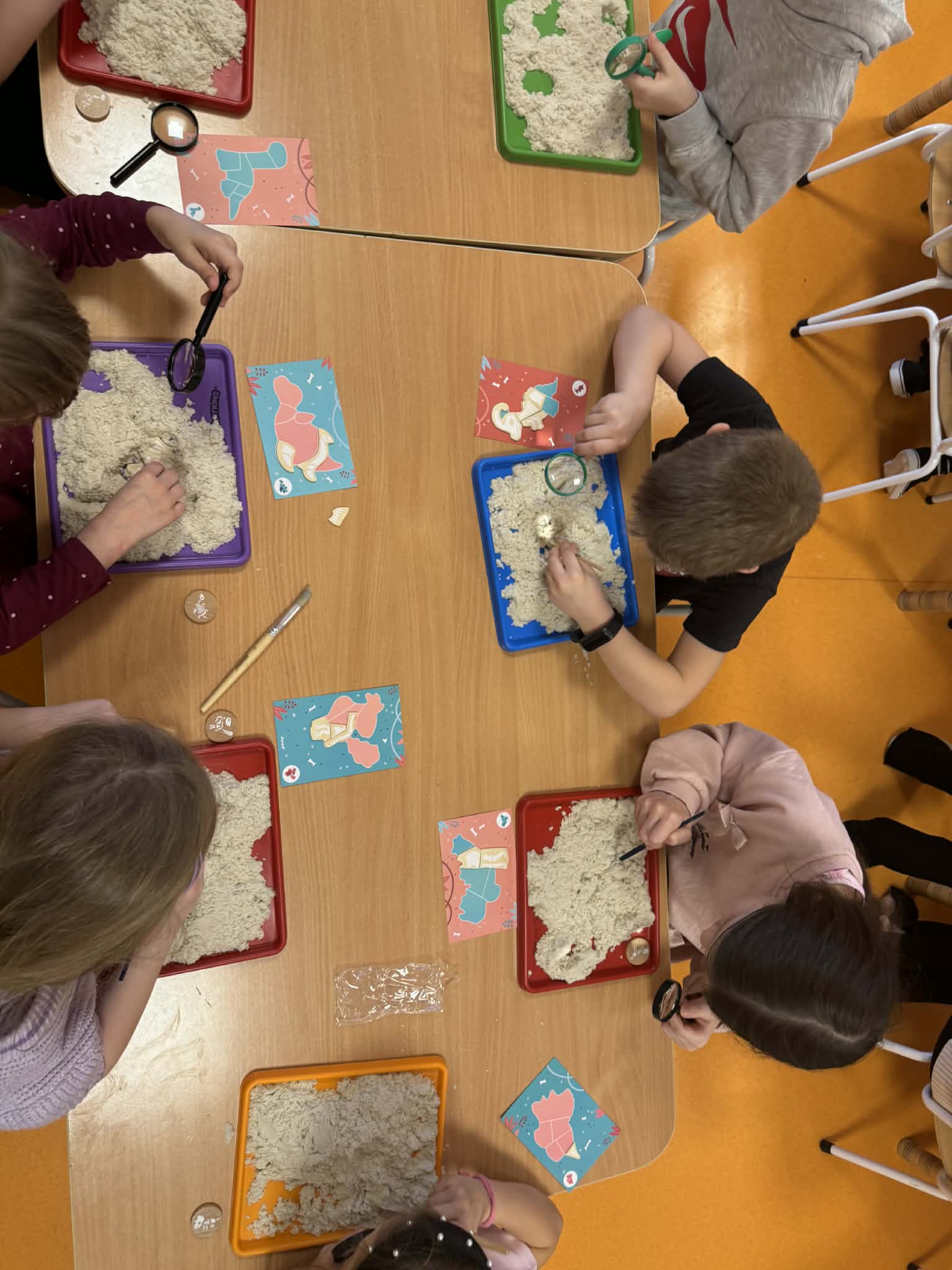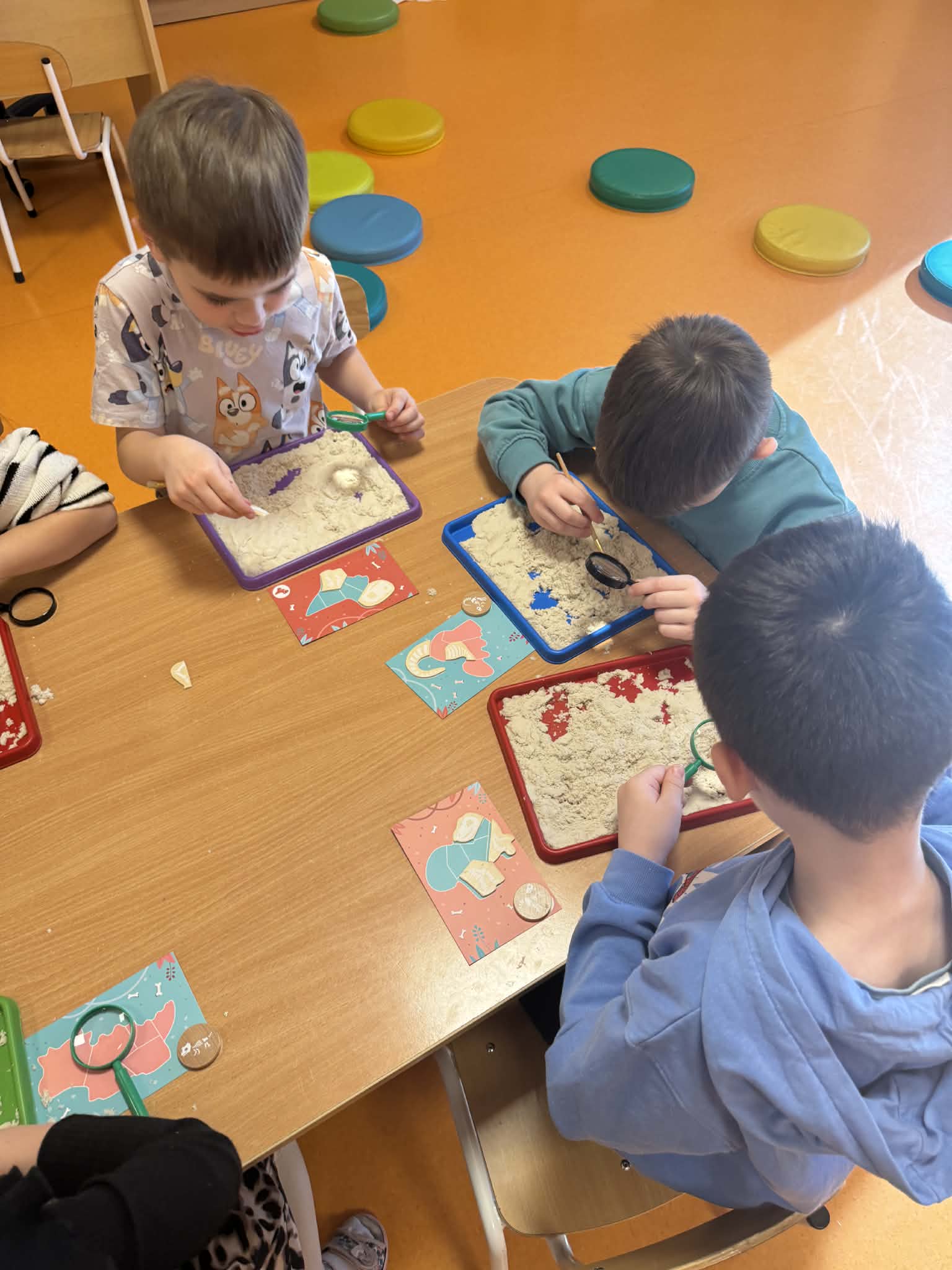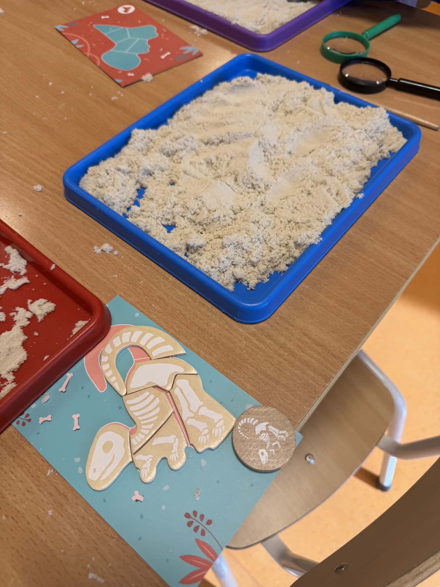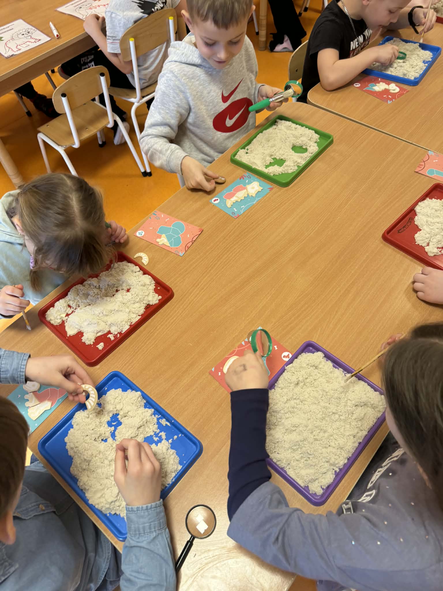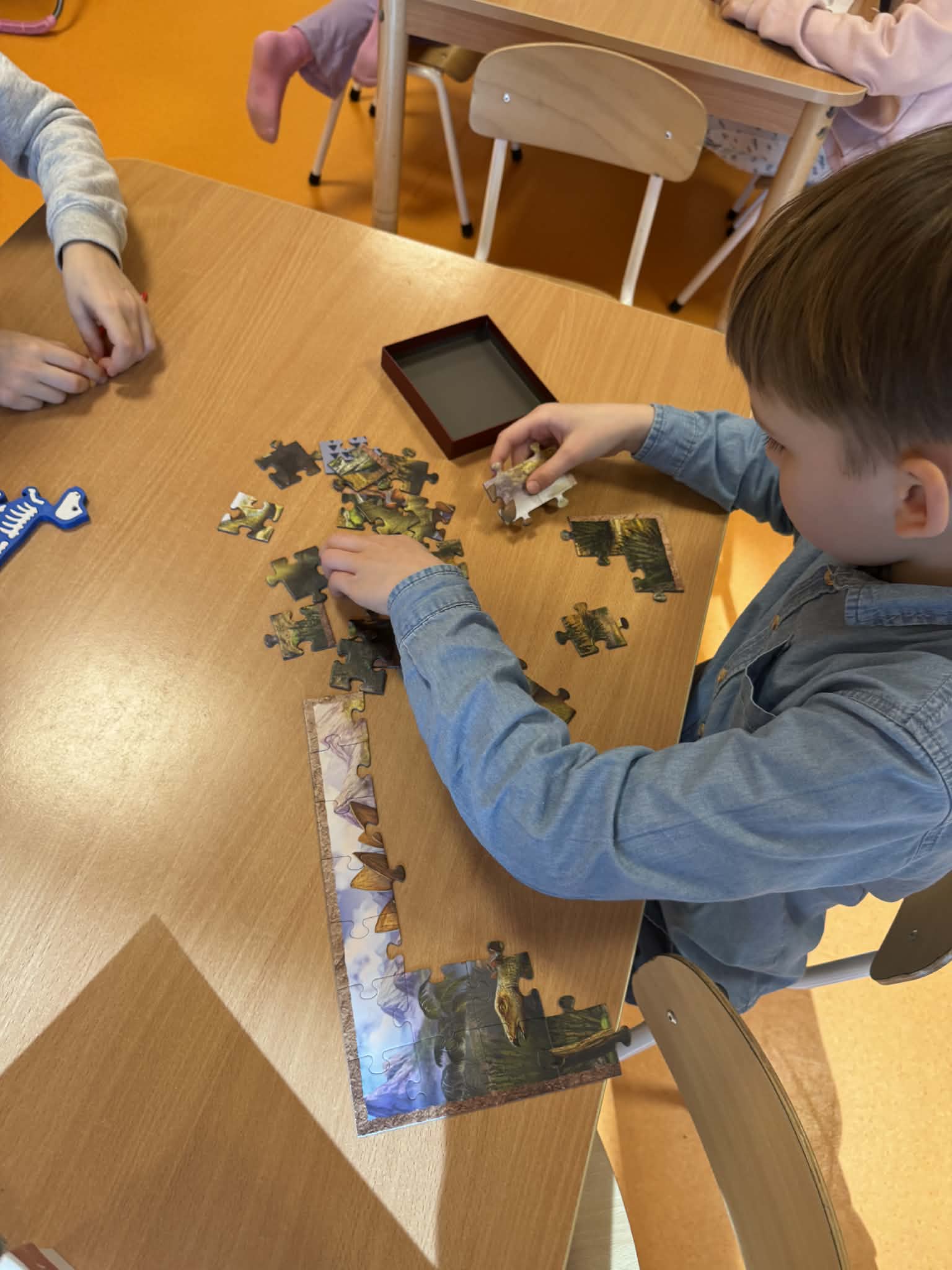 Dziś Sówki Pomarańczowe miały zajęcia z okazji Dnia Dinozaura. Przygotowane stacje zawierały wykopaliska paleontologiczne, puzzle tematyczne, układanki magnetyczne, książki z ciekawostkami w tym Albik, karty grafomotoryczne wielokrotnego użytku. Na koniec dzieci wykonały prace plastyczną z wykorzystaniem kartonowych szablonów, które ozdobiły farbami według własnego pomysłu. Różnorodne aktywności zakończyły sie zdjęciem w fotobudce. Dinozaury opanowały całą salę.